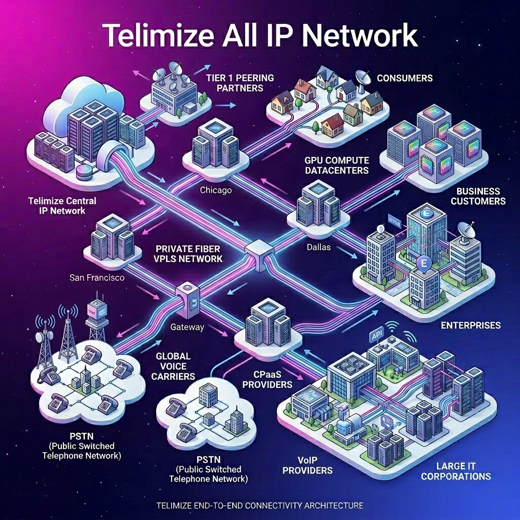 Telimize delivers high-performance voice connectivity through a secure and redundant VPLS infrastructure designed for telecom-grade operations.